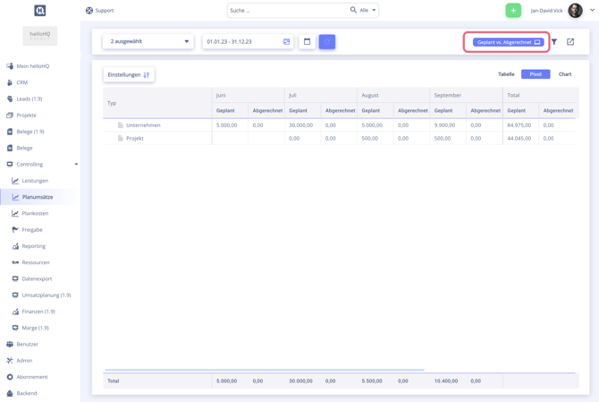 Im Controlling Planumsätze seht ihr, welche potentiellen Umsätze in der Pipeline liegen, was für die Rechnungsstellung geplant ist und was tatsächlich abgerechnet wurde.