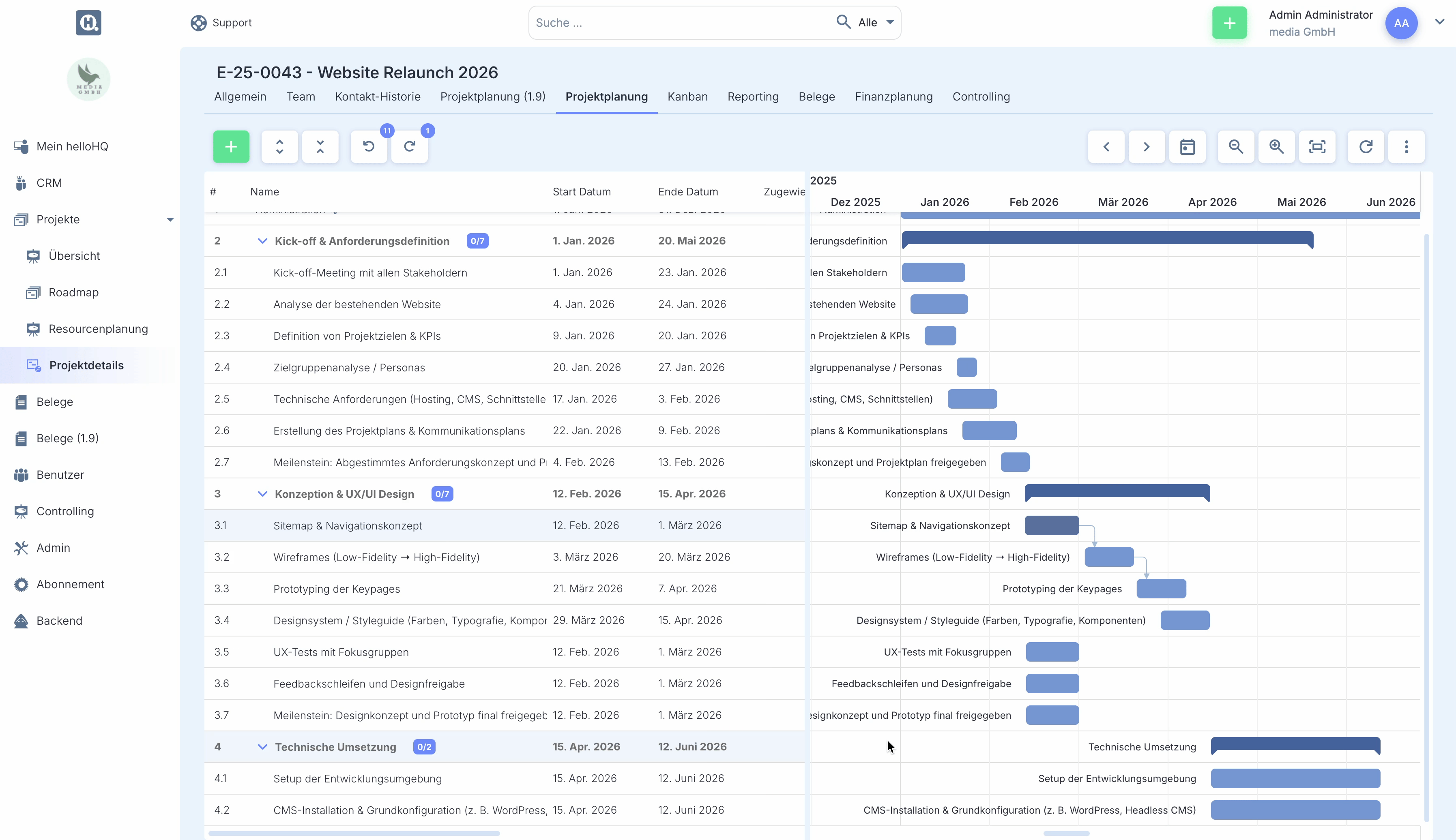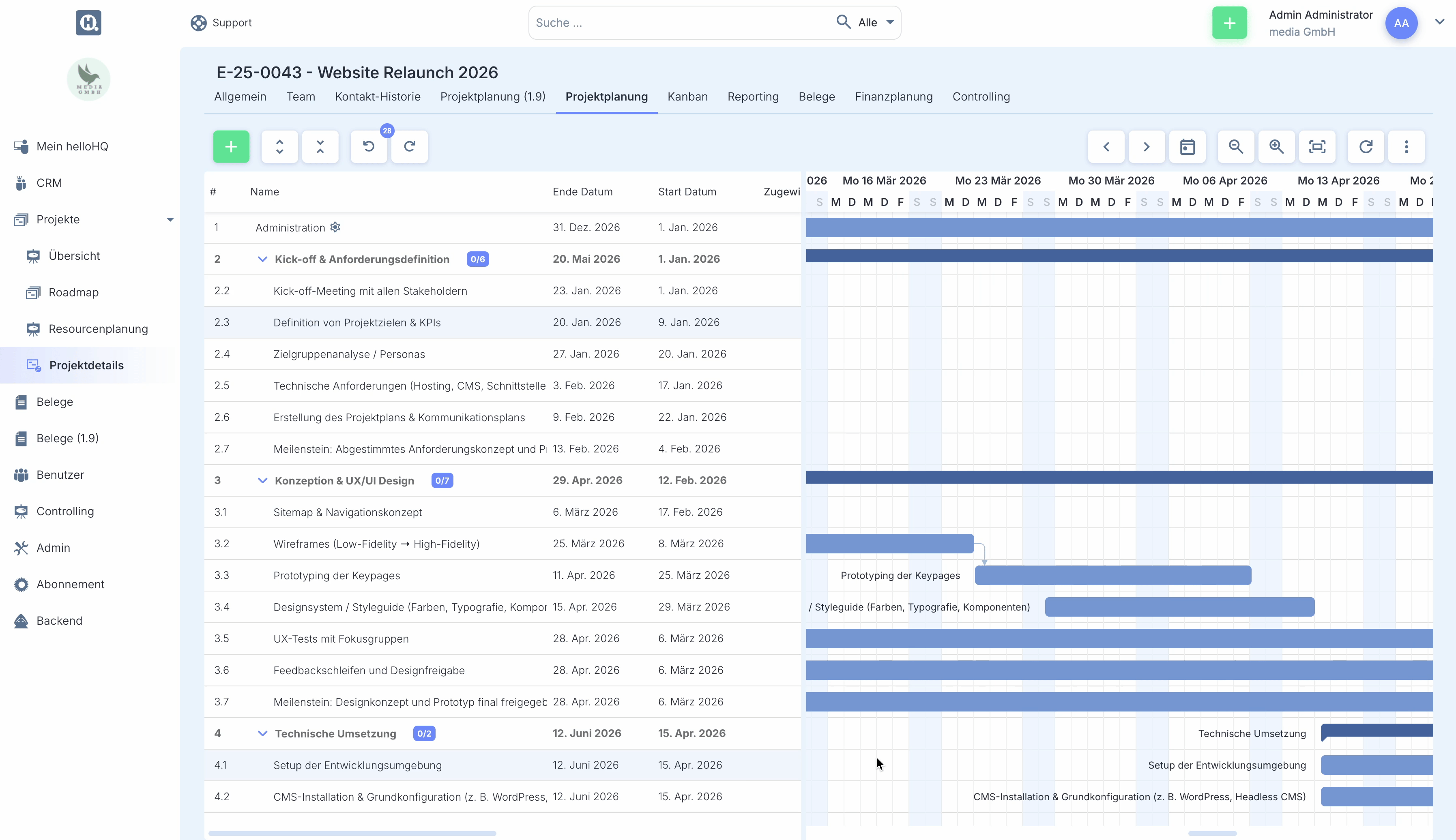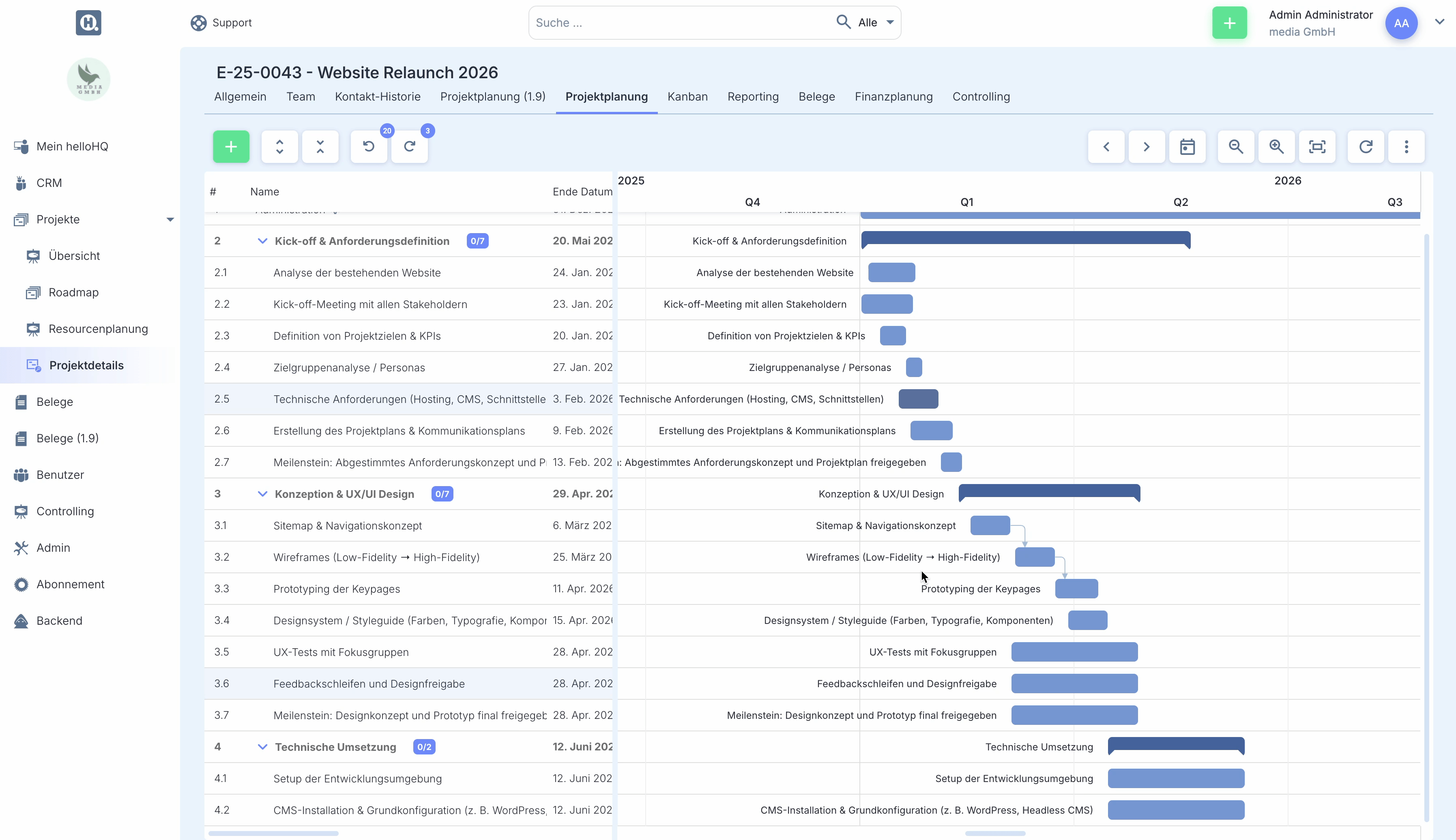 Mit der Projektplanung in helloHQ behältst du jederzeit den Überblick über deinen Projektfortschritt. Du kannst Projekte in Phasen, Aufgaben und Unteraufgaben strukturieren, Termine anlegen, Verantwortlichkeiten klar zuordnen und Abhängigkeiten sichtbar machen.