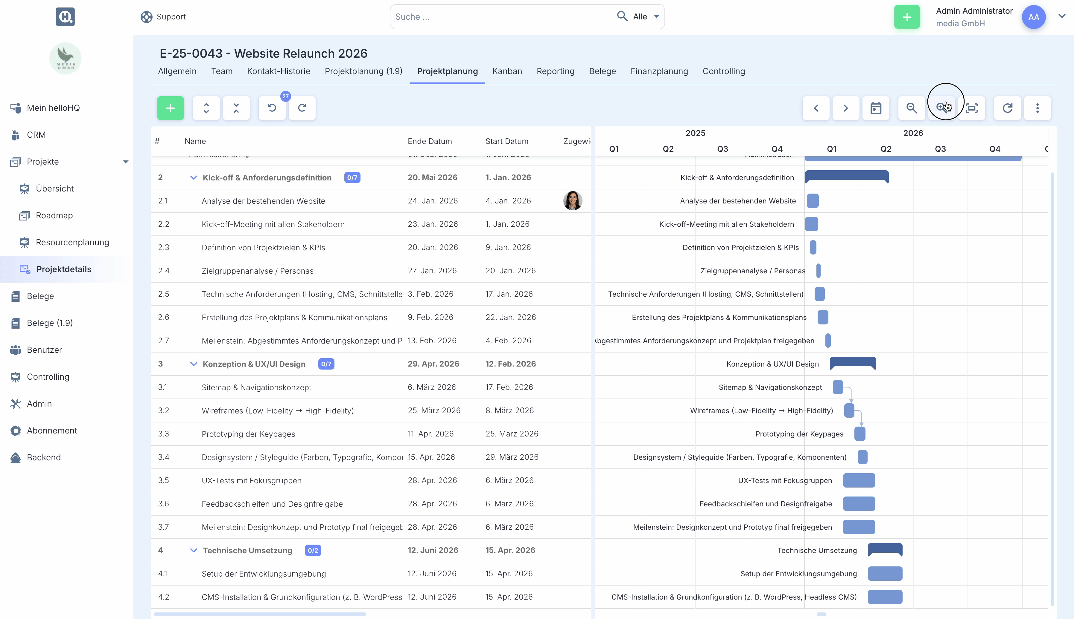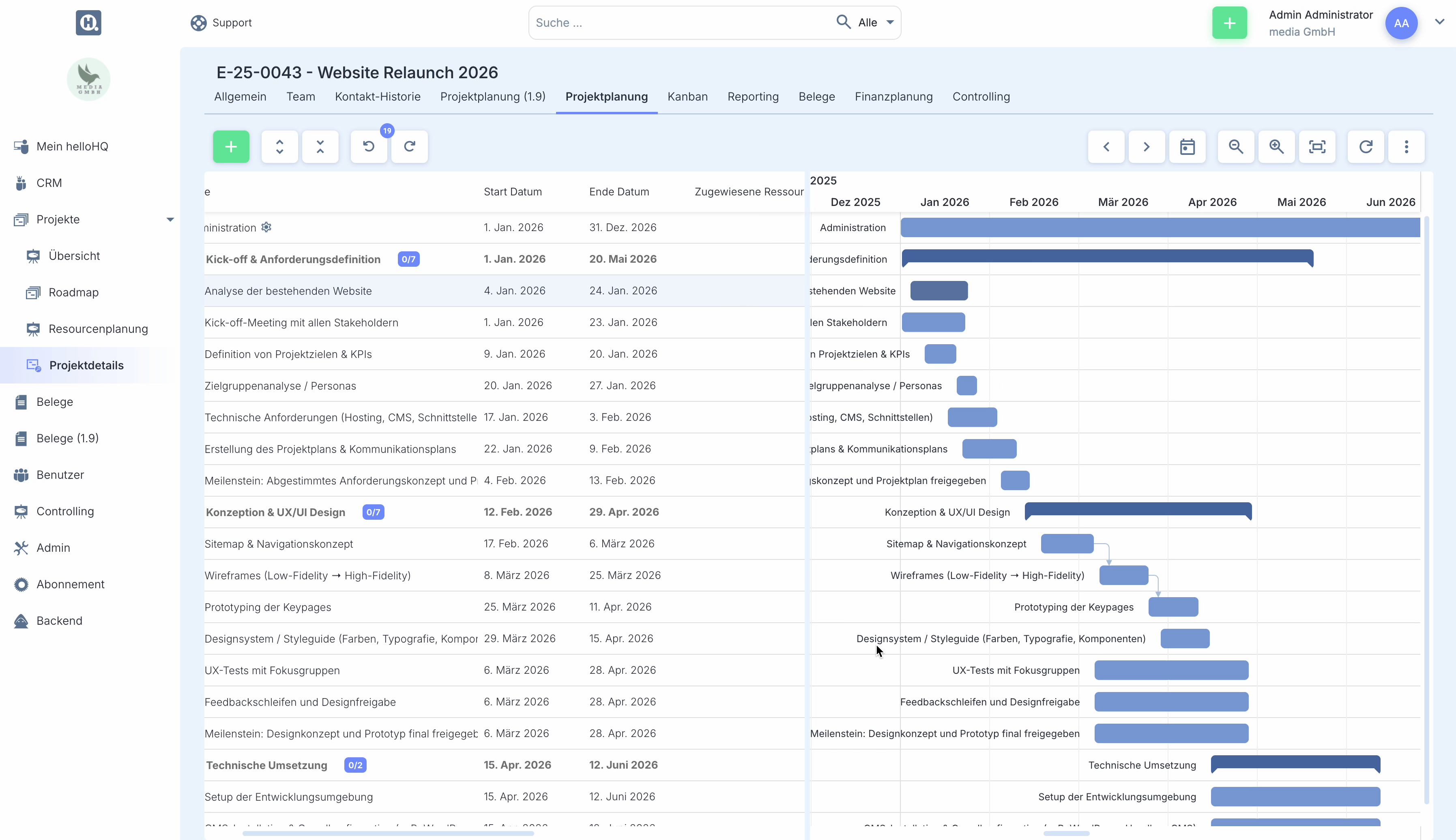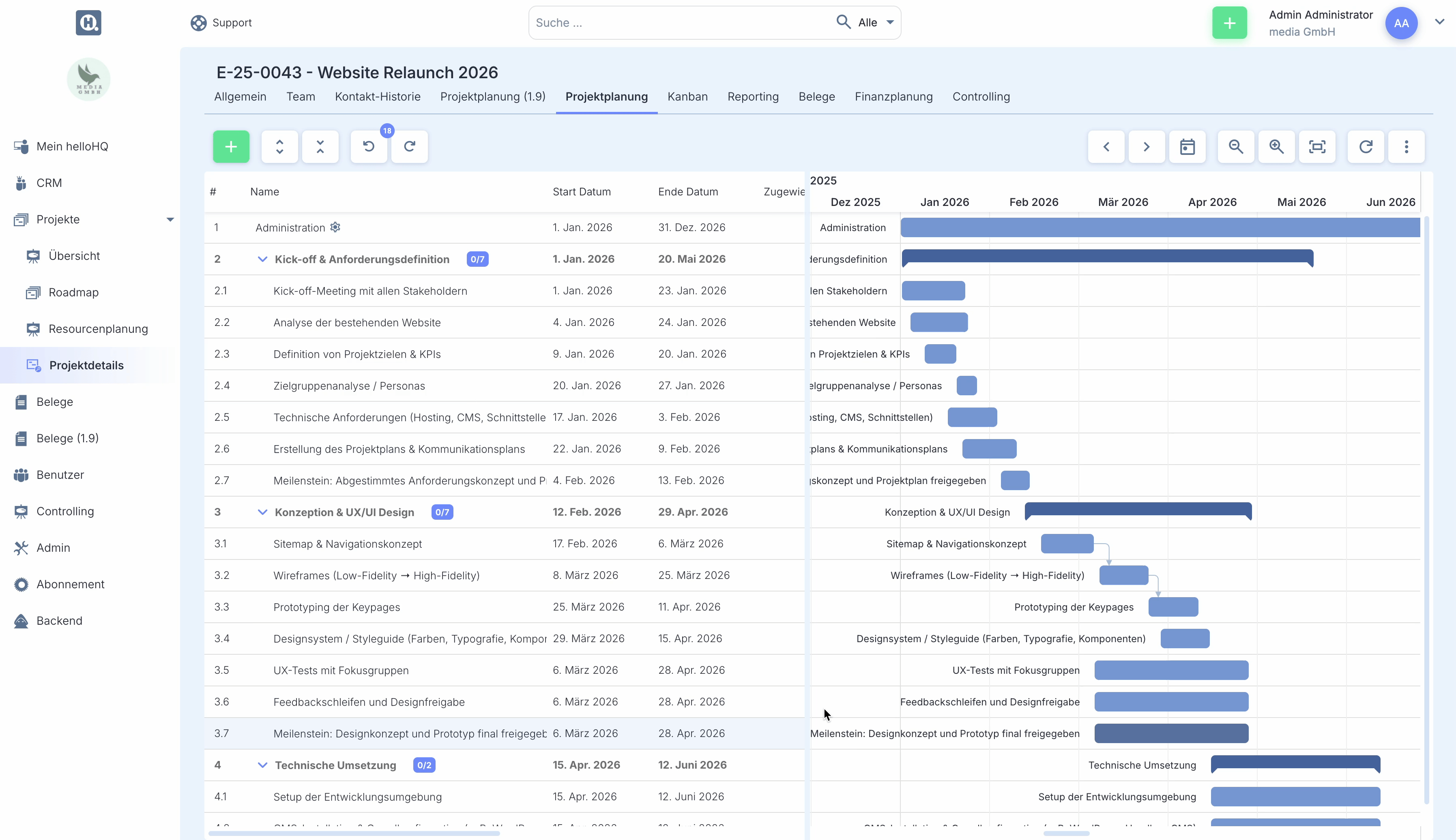 Mit der Projektplanung in helloHQ behältst du jederzeit den Überblick über deinen Projektfortschritt. Du kannst Projekte in Phasen, Aufgaben und Unteraufgaben strukturieren, Termine anlegen, Verantwortlichkeiten klar zuordnen und Abhängigkeiten sichtbar machen.