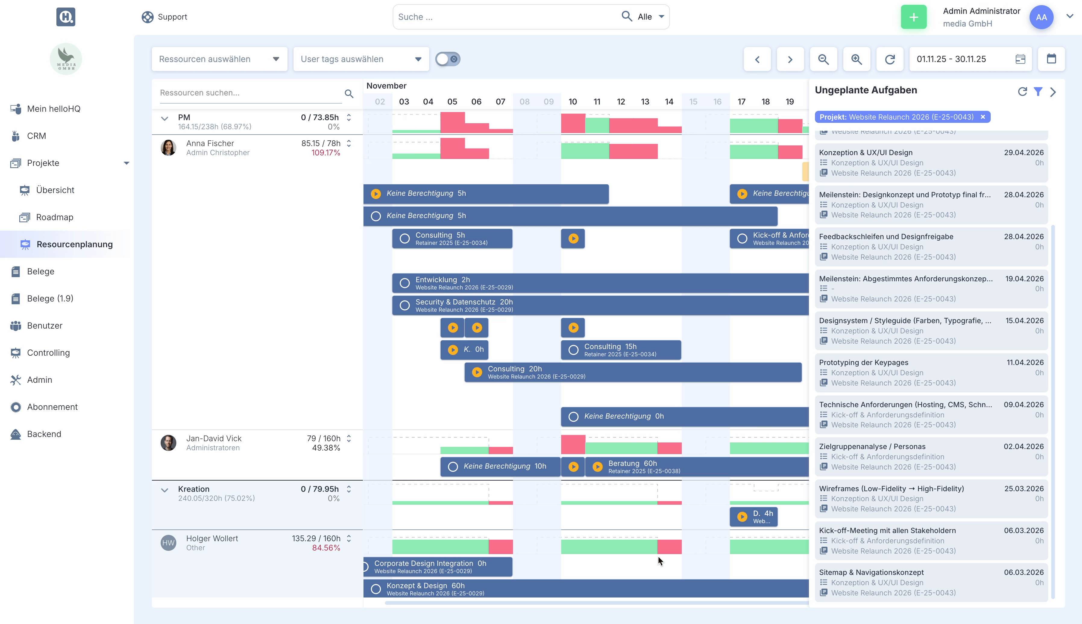 Die Ressourcenplanung dient dazu die Kapazitäten und aktuellen Aufgaben aller Ressourcen schnell und einfach in einer Ansicht betrachten zu können und hilft dabei die Aufgaben ein- und umzuplanen.